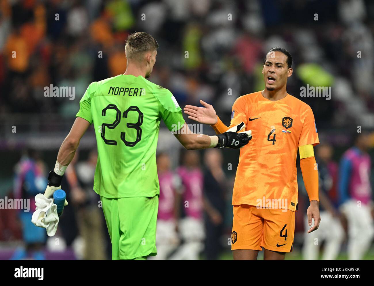 Doha Katar 25 November 2022 Andries Noppert L Niederlandischer Torwart Reagiert Mit Dem Teamkollegen Virgil Van Dijk Nach Dem Spiel Der Gruppe A Zwischen Den Niederlanden Und Ecuador Der Fifa Weltmeisterschaft 2022 Im